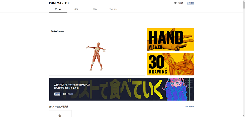 デッサンをするといっても即座に人間のモデルを用意できるわけはありませんので、私は練習の時には下記のサイトを利用させていただいています。