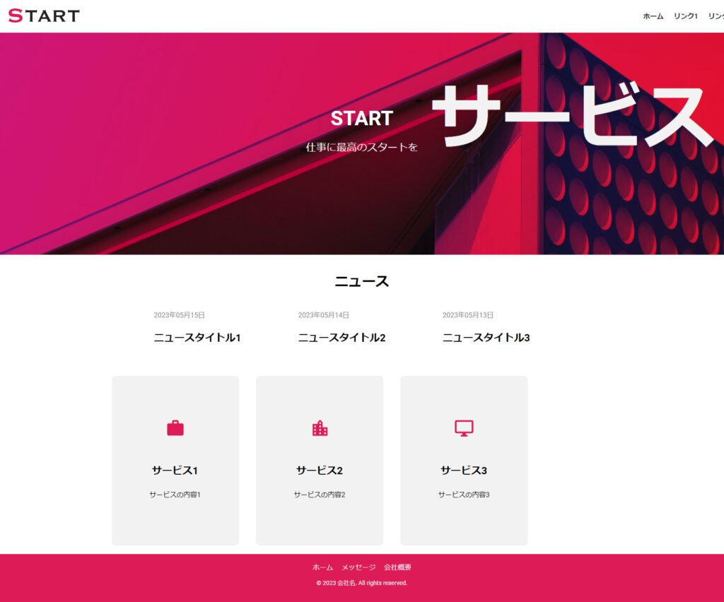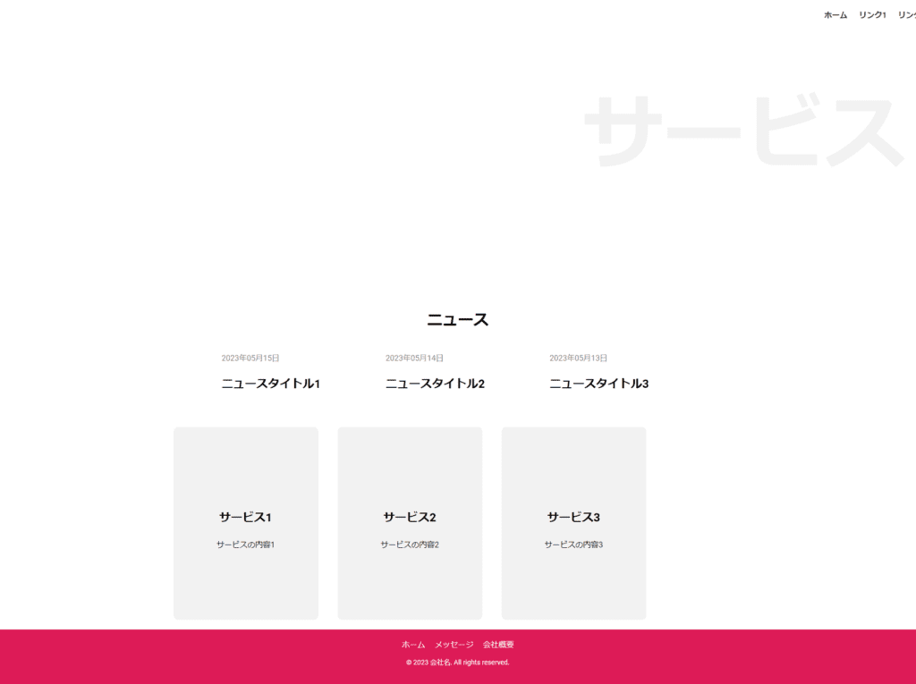 <footer class="footer"> <nav class="footer-nav"> <ul> <li><a href="#">ホーム</a></li> <li><a href="#">メッセージ</a></li> <li><a href="#">会社概要</a></li> </ul> </nav> <p class="copy">© 2023 会社名. All rights reserved.</p> </footer> <style> .footer { background-color: #DD1B57; padding: 20px; text-align: center; color: #fff; } .footer-nav ul { list-style: none; padding: 0; margin: 0; display: flex; justify-content: center; margin-bottom: 10px; } .footer-nav li { margin: 0 10px; } .footer-nav a { color: #fff; text-decoration: none; } .copy { font-size: 14px; } </style>上記のコードでは、<footer>要素でフッターセクションを囲み、その中にナビゲーションリンクとコピーライトを配置しています。フッターセクションの背景色はCSSのbackground-colorプロパティを使用して#DD1B57に設定され、テキストの色は#fff(白)に設定されています。