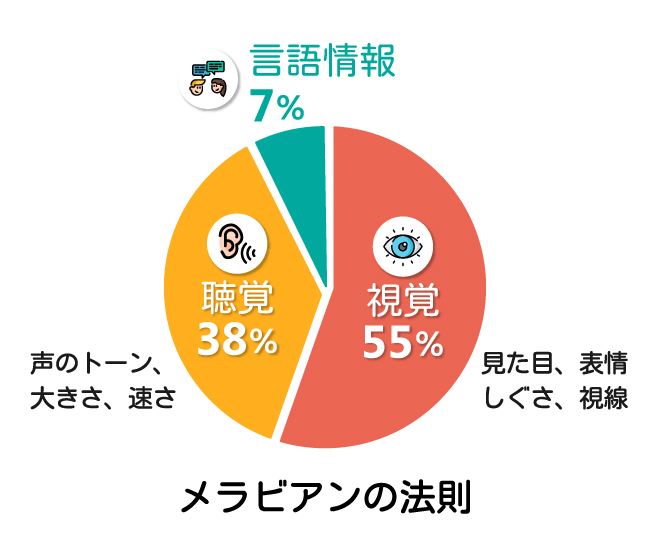 メラビアンの法則というものがヒットしました。これは、話し手が聞き手に与える印象に関する法則だそうです。