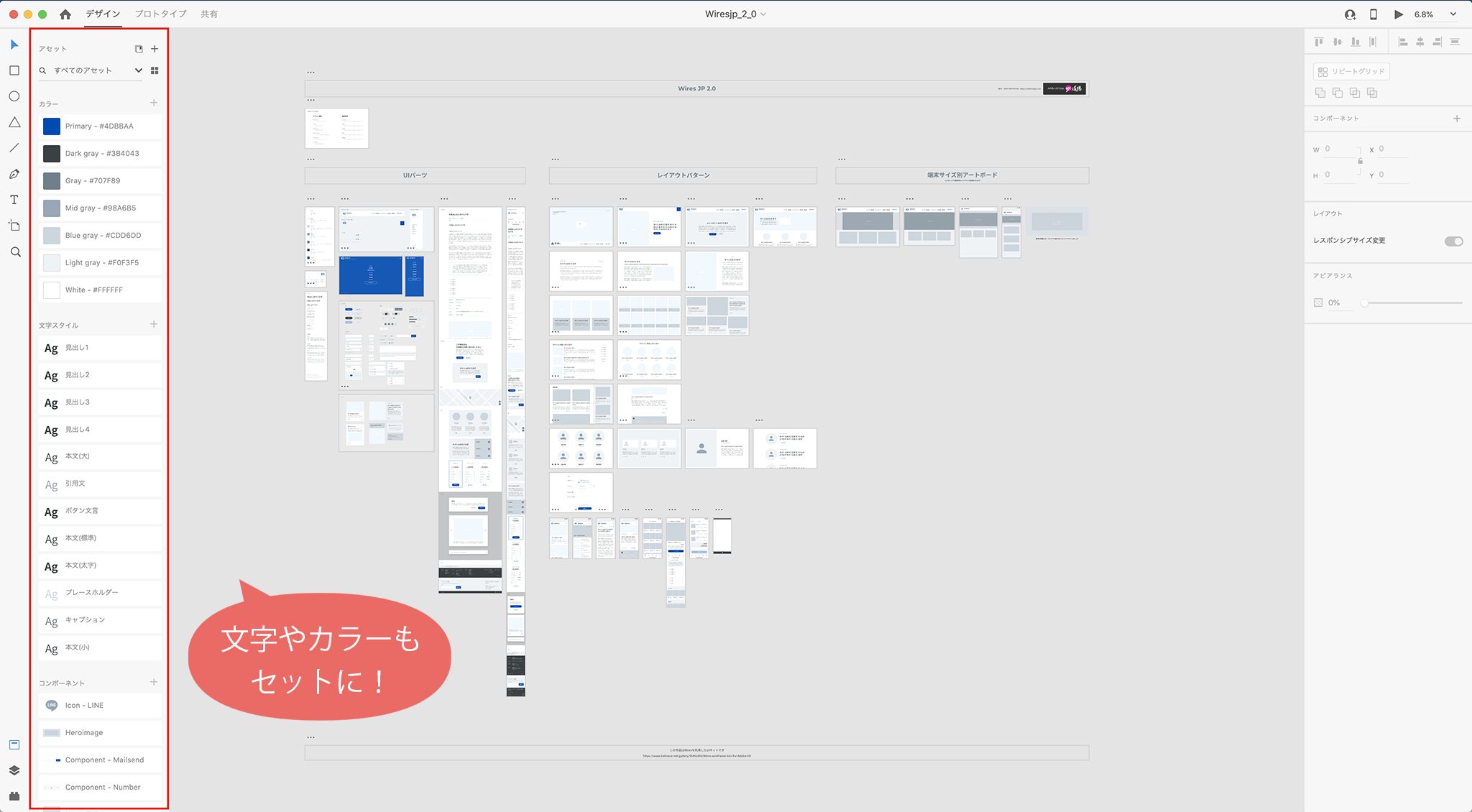 あとは、Wires jpにあるレイアウトをコピーアンドペーストで持ってきたり、アセットの素材を組み合わせてオリジナルのレイアウトを制作したりすれば、あっという間にデザインは完成です。楽チン!!