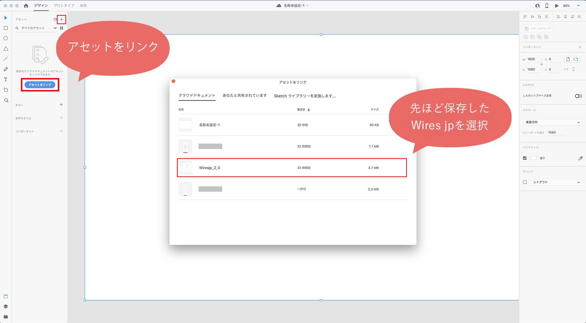 アセットをリンク(もしくは+ボタン)をクリックすると、クラウドに保存しているデータが表示されます。