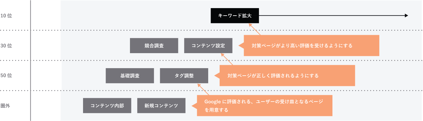 SEO施策: 効果につながったキーワードに対して、 SEO施策を行うことでSEOの効果の最大化を計ります。